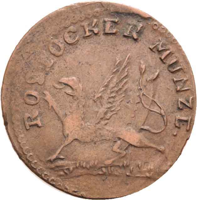 | Vorderseite | A. (08.00 Uhr): ROSTOCKER MUNZE Greif nach links auf Boden mit einem Flügel und einem Schweif. |