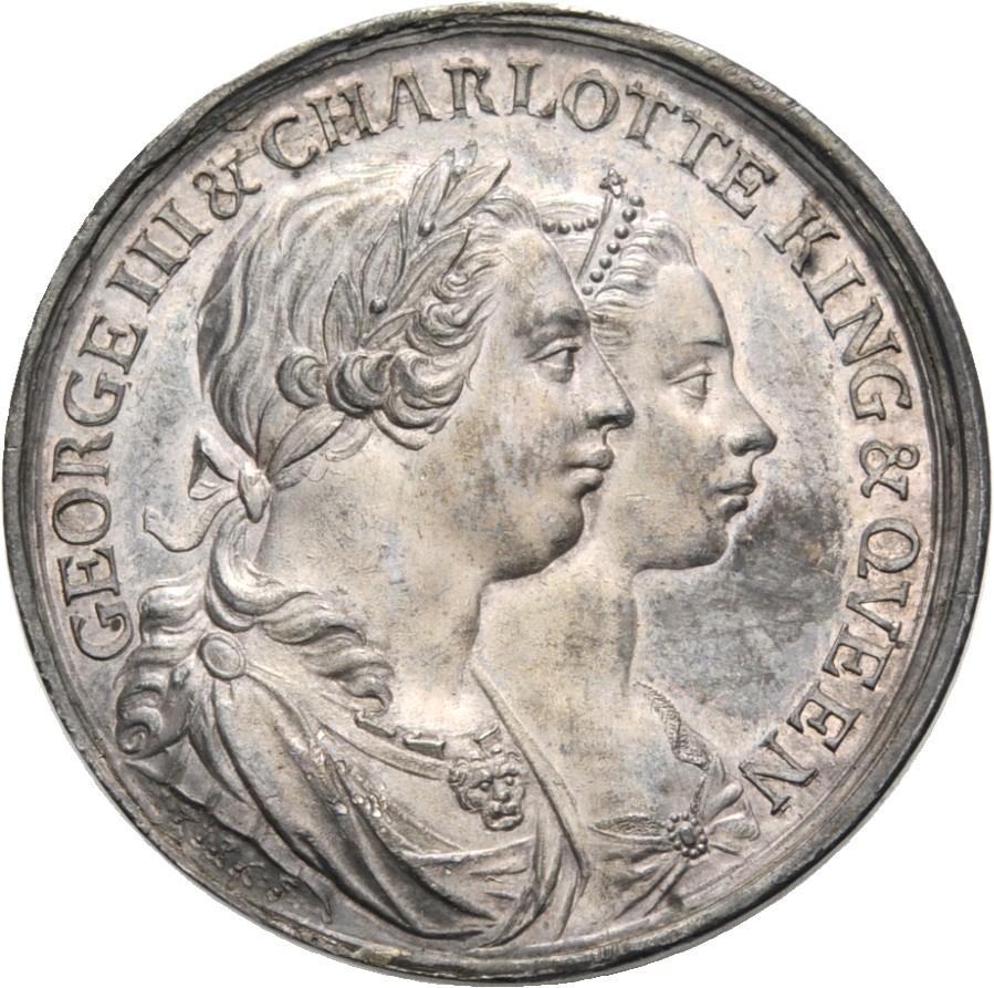 | Vorderseite | (08:00 Uhr) GEORGE III & CHARLOTTE KING & QVEEN (Georg III. und Charlotte, König und Königin). Büsten beider versetzt nach rechts. Georg III. mit Lorbeerkranz, Charlotte mit Diadem. Im Armabschnitt (07:00 Uhr): I·KIRK·F· (John Kirk fecit - John Kirk hat es gemacht). |